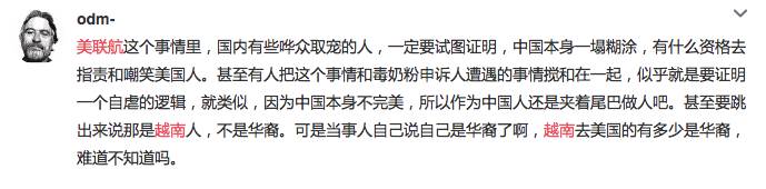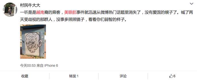 还有一些国人网友喜欢装清高,装理性,讽刺那些指责美联航涉嫌种族歧视的人,觉得中国人小题大做,喜欢什么都往种族歧视上撤,而且新闻核实被打的人是越南裔之后,就说抗议美联航的人是在啪啪打脸。