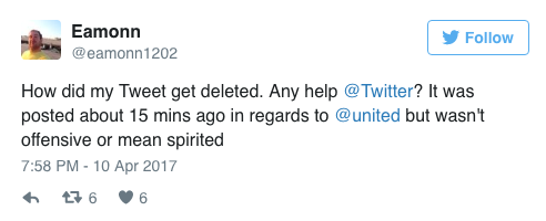 “为啥我的推特会被删除呢?@Twitter能帮帮我不?我十五分钟之前发了一条吐槽美联航的言论,但这个吐槽并没有攻击性。”