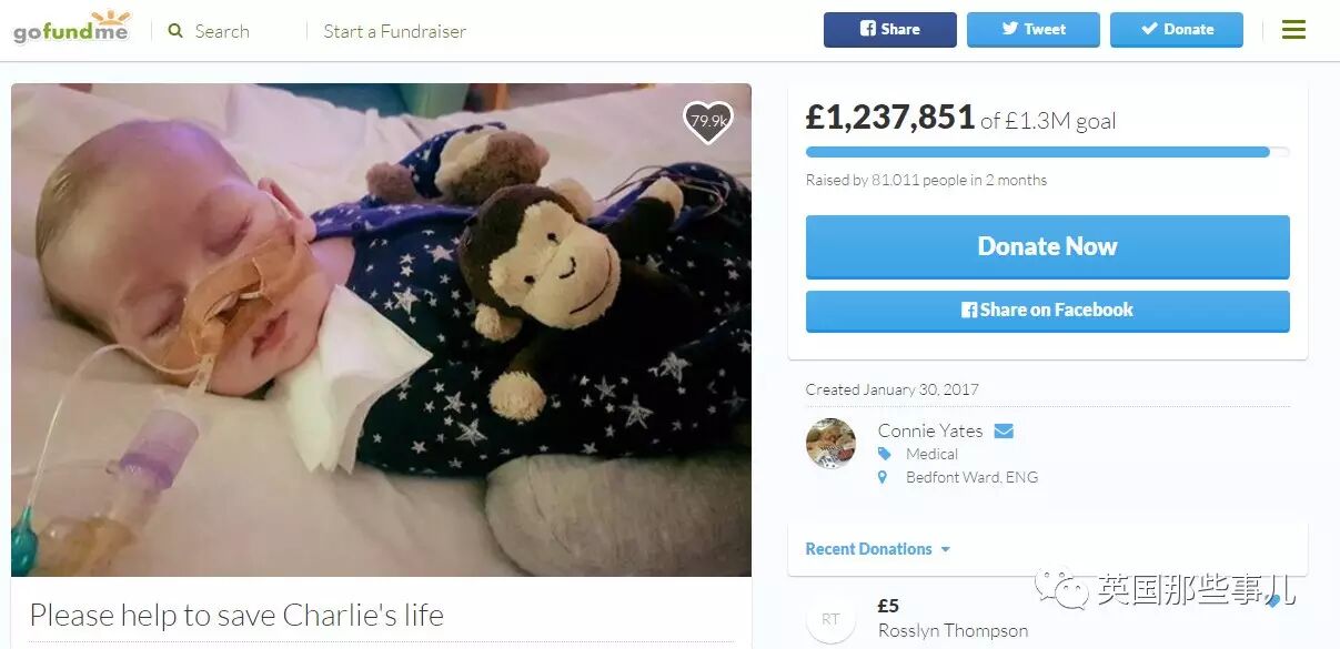 夫妇俩还在Gofundme上建了一个捐款页面,目标是130万英镑, 他们希望一旦判决成功,就能带着孩子去美国,就算法院想对他们不利,也能告诉法院全英国的民意.... 从3月中旬到4月2日(也就是开庭前一天),有81000多名好心人帮忙, 总计捐款超过123万英镑!