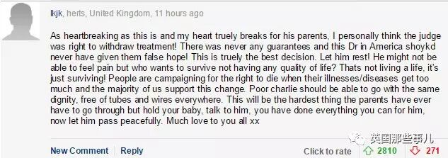 是很痛心,但我觉得法官做的没错!没人能确保治疗有效,美国医生给的也不过是虚幻的希望! 让孩子死去确实是最好的选择了。也许他感受不到疼痛,但谁愿意这样活下来呢? 这不是生活,仅仅是生存! 现在很多人为了用安乐死来结束病痛的生命不断抗争,可怜的Charlie也需要这样有尊严地死去。 对父母来说确实是艰难选择,但抱着你的宝宝,告诉他,你们已经尽全力了。让他平静地走吧...