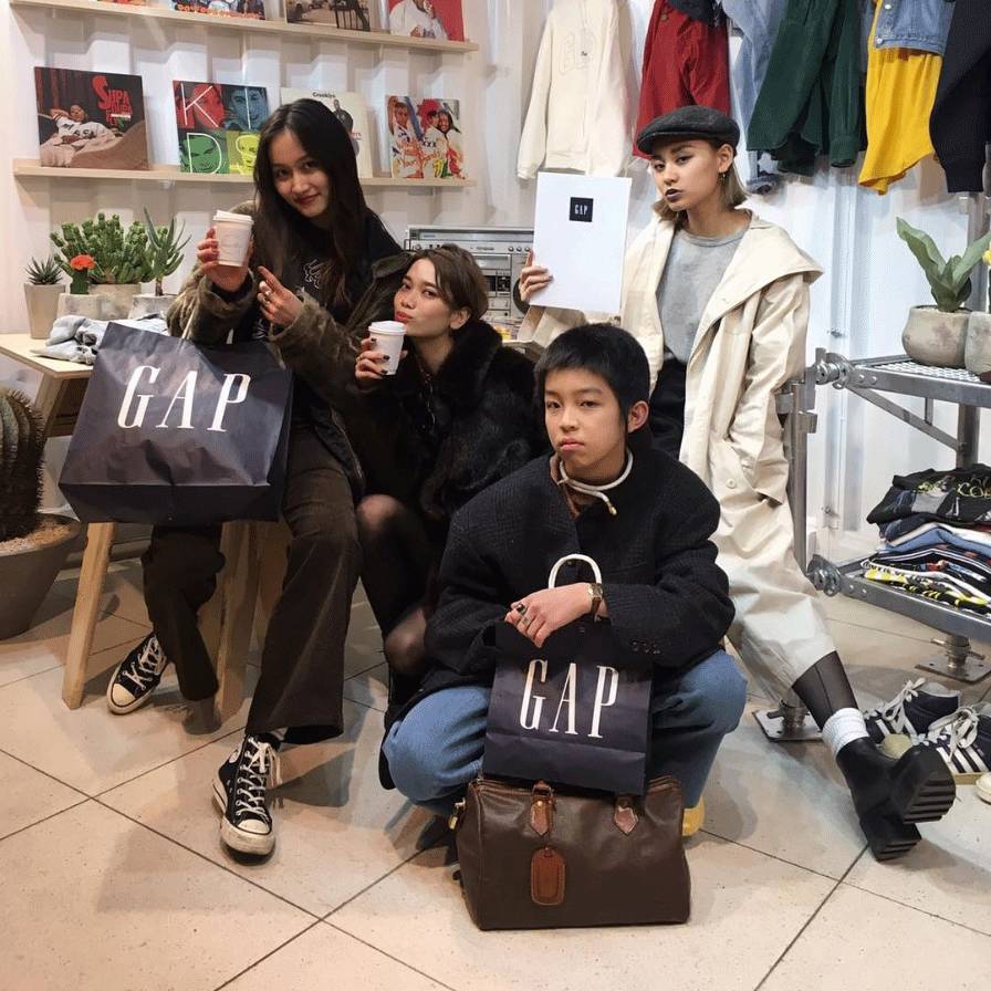 仍然摆着一副臭脸,14岁的Yoshi把大姐姐主持人领进一家原宿的店,随便几下就搭了一件长款Oversize大衣。