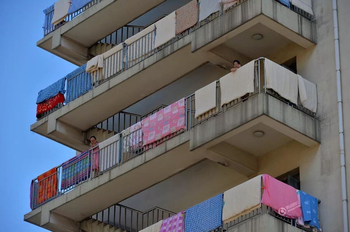 和美国一样,国内大学宿舍也都会配备一些洗衣机,但单衣和小件衣物多数人还是会选择手洗,洗完了挂在阳台,远远看上去跟联合国总部似的。