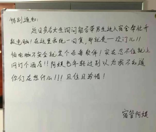 某高校宿管老师霸气留言。图片来源:搜狐教育