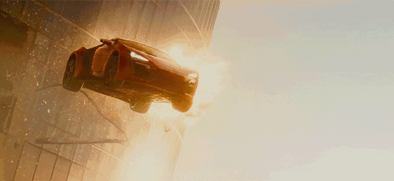 开着世界上仅有七辆的限量版豪车狂飙,从一栋高楼飞越到另一栋高楼里:
