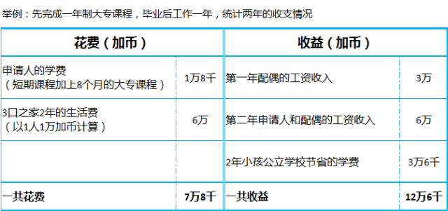 很多人都想移民,然而并不知道持有旅游签也可以办理申请移民。其实持有旅游签可以在加拿大境内转成学签,只读一年的课程再工作一年,就可以申请移民!流程简单、低成本高效率、移民成功率高! 通过这种途径,大龄申请人可以在缺少资金历史证明,不需要雅思成绩的情况下,顺利获得学签。而获得学签之后短暂学习,毕业后就可以获得毕业工签,并且找到工作,申请移民。这种方式相较于技术移民的要求而言低了很多,相较于投资移民又不需要太多资金投入。可谓是门槛最低,花费最少,成功率最高的移民方式。 我们帮助一个普通三口之家的申请人算过一笔帐,对比开销和收益,来看看这个项目到底花多少钱?