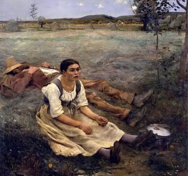 9 A) k3 h2 J/ T( n9 w+ {《垛草》是勒帕热的一幅代表作。1973年3月,这幅画与《法国19世纪农村风景画展》一起曾在我国展出,也许看过画展的人们至今仍记忆犹新:那因“垛草”而劳累过度躺在草地上酣睡的农夫,他好象刚刚吃过妻子送来的饭,用草帽盖着脸正在享受着这片刻的轻松;年轻体壮的妻子默默的坐在丈夫的身边,长期生活的艰难使她显得疲惫不堪,神色已变得向老年人一样呆滞而默然。