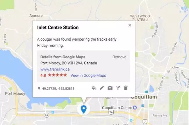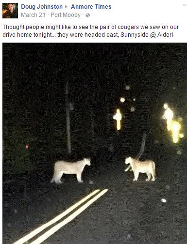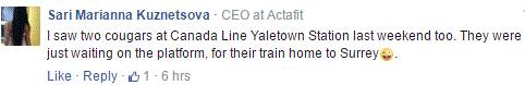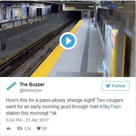 这位姐姐爆的料更猛,上周末我在加拿大线耶鲁镇(Yaletown)站的站台上看到两只美洲狮,它们好像正要搭车回素里的家呢。