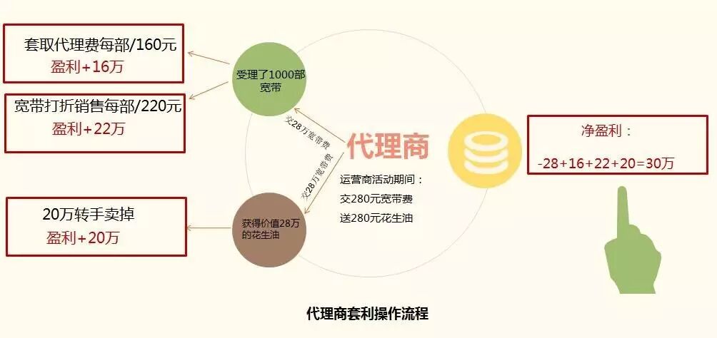 电信行业流传着一个经典的套利案例,运营商年底需要冲量冲业绩,用户交280元宽带费,就可以得到280元花生油,活动时间一个月。这时有一个代理商知道了立刻交了28万元,受理了1000部宽带(那时实名制要求不严,一个身份证就可以办理无数部宽带),将这28万的花生油拿到手之后,代理商立刻转手20万卖掉,受理的1000部宽带,从运营商那里套取了代理费每部160元,共计16万元。