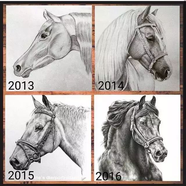 Leontine尤其喜欢画马, 翻出小时候的作品, 那真叫一个惨不忍睹, 连自己都不忍直视。 为了把马画好, 她开始了千万遍的练习。 3 F2 D$ A5 H9 \3 F! N# ^: s0 [