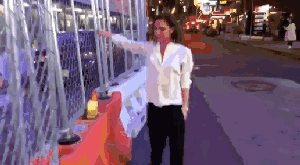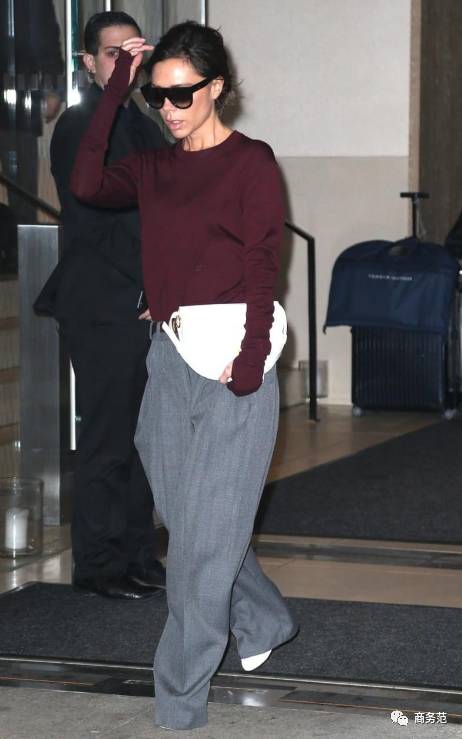 ' H5 T( u) c- Z* L6 B" `, C贝嫂即使穿了高跟鞋,但是阔腿裤拖地的时候,整体造型还是有些撑不住。
