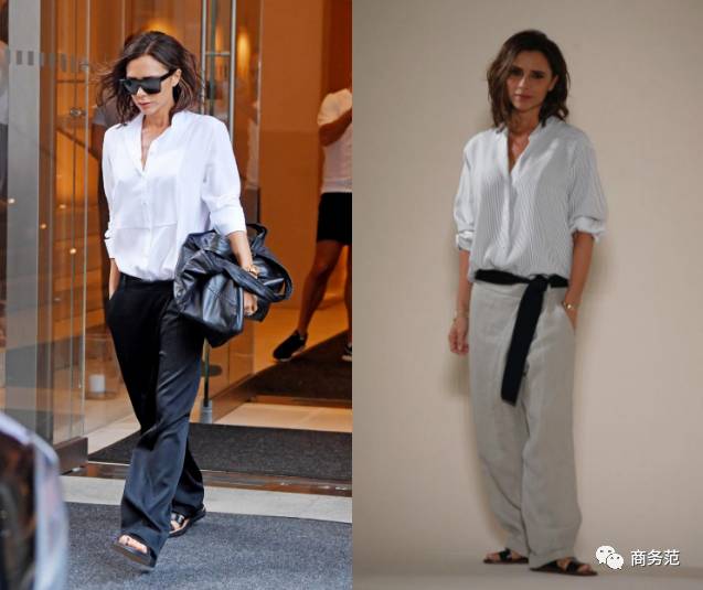 但是下面的阔腿裤+平底凉鞋。上下身比例已经变成5:5,感觉维多利亚已经弃掉腰线。