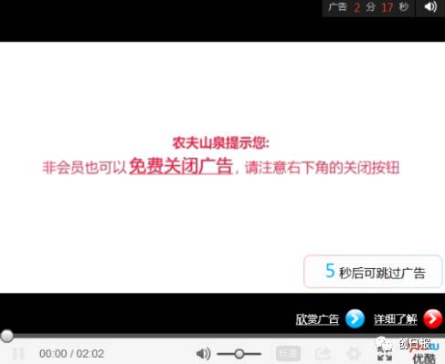 ▼ 支付了视频平台巨额的广告费,却可以让用户任意关掉,这是绝对是视频网站广告诞生以来最成功的一则广告了。被视频网站60秒甚至是100秒的广告“折磨”的网民不计其数,如今竟然有这么一则广告不用充会员就可以免费跳过,农夫山泉正是抓住了这一痛点。