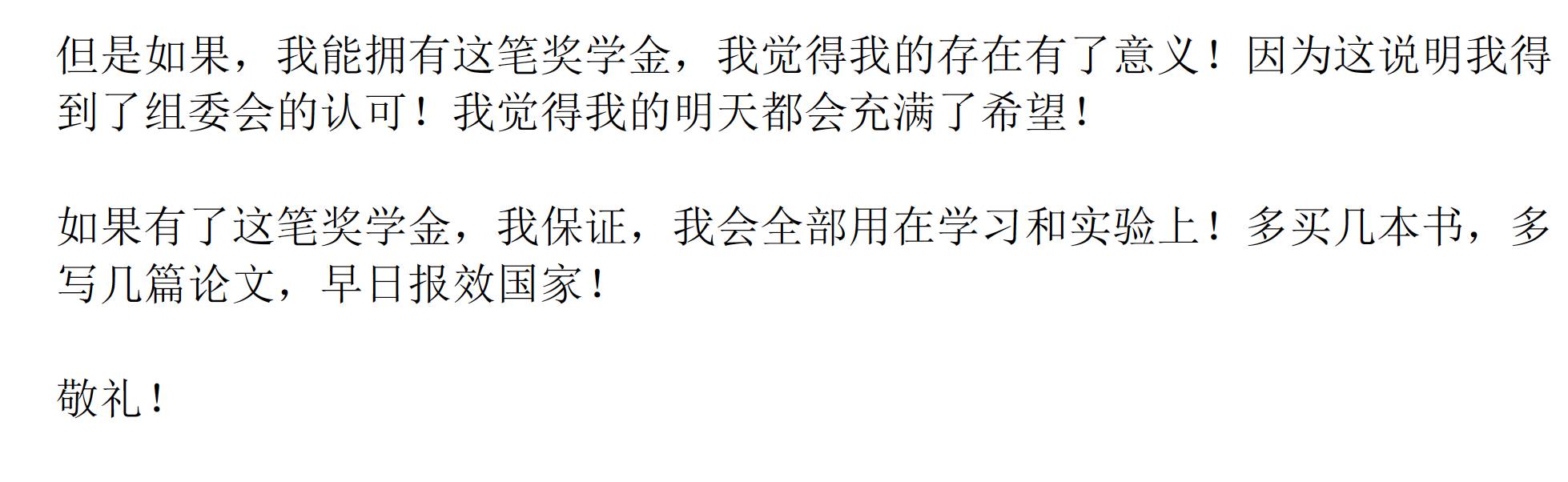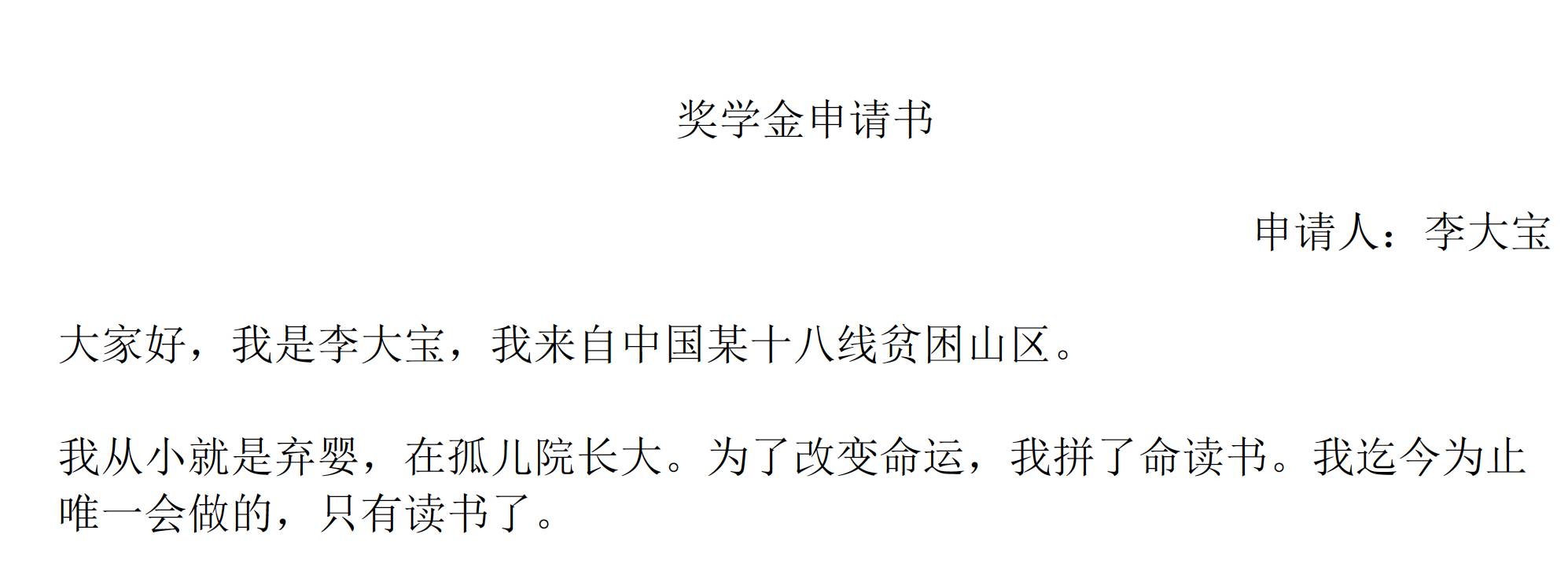 这不,为了一举拿下这个4位数的奖学金,他研究了各大选秀活动现场的个人感言集合,写出了一篇令人声泪俱下的奖学金申请书。