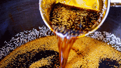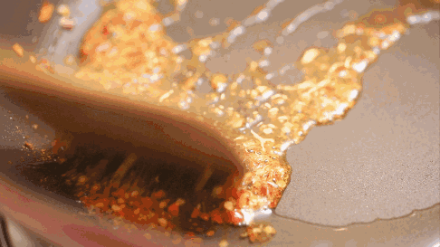 2 e" M) _1 X7 d油五成热时下芝麻关火搅拌均匀,芝麻和辣椒的香辣恰到好处,还能有效避免糊锅。