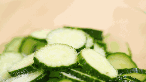 , M* Z# g5 b7 c! s5 t) X; R" P第二步:腌制黄瓜。将黄瓜装入碗中,加一勺盐,用手抓匀后腌制5分钟。