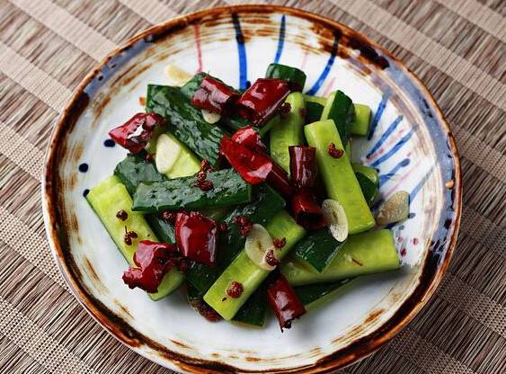 $ ?4 U/ f/ W3 G$ b! j第三步:椒香味浓郁时,倒入挤干水分的黄瓜片,撒上些许食盐,翻炒均匀即可出锅!