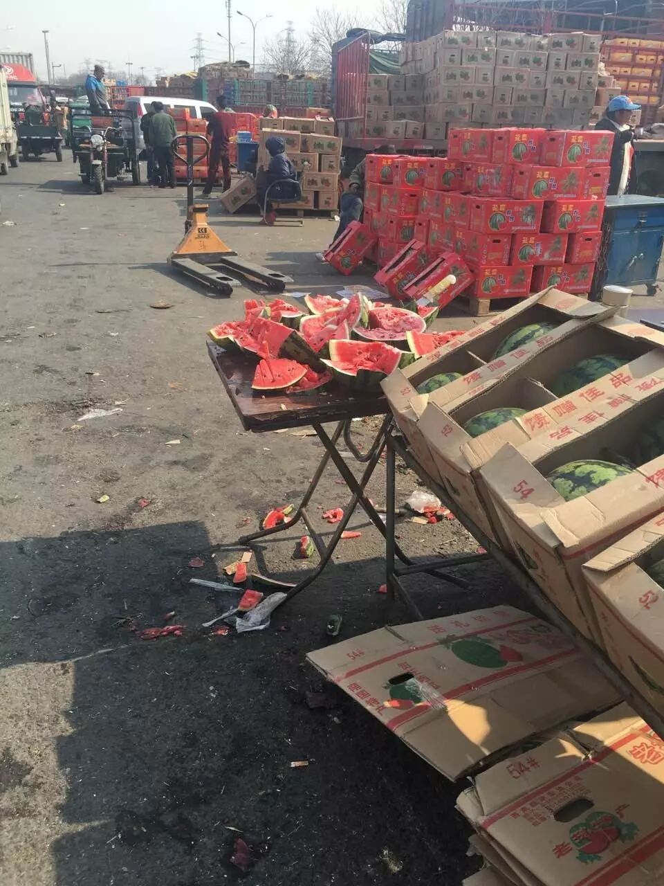 刀直直插在水果上,这是摊位前摆放的一点供人品尝的样品,简易办公桌旁边是称重的磅秤、秤砣都是平时几乎难以见到的“超大型号”,小车直接从装满货物的大车上拉货。车流如织,杂乱无序,置身此地,仿佛不是在首都北京,除了担心被撞,这场景接地气地让人感到痛快。 " @% A1 Q% h) M+ U& V( p: C