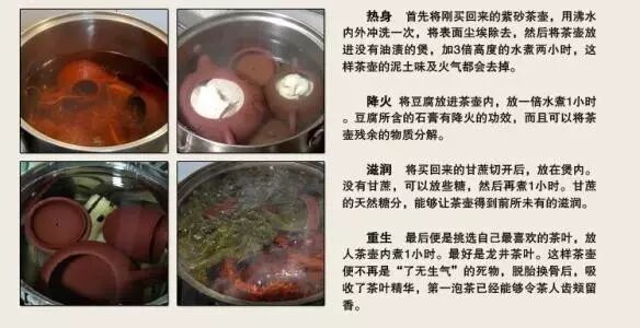 闻气味 化工料因含有毒化学杂质,往往有很大的刺鼻气味。紫砂因为有双气孔结构,所以一般紫砂壶都会吸收周围的气味,比如泥土味、窑火味、柜子的味道、包装盒味道等等,所以新购紫砂壶有点味道是正常的,开壶后会基本消失。但化工料的味道不用细闻,远远就能闻到让人感觉不舒服的刺激性气味,开壶后也无法去除。 辩泥色 原矿泥料的颜色大多不会太艳。一是由于早期的紫砂良多是浅表层的,本身就有了一定的原始风化。二是由于紫砂矿从地下被挖掘上来以后,要放置露天场地 日晒雨淋一年半载,天然疏松变成小颗料后,再碾磨成粉,最后再经由锤打陈腐才能使用。经风化陈腐的原矿泥中的金属物质会发生氧化作用,泥色就会发暗、发 沉、发旧,不会有新鲜亮丽的感觉。有些泥料会陈腐存放几十年,甚至百年以上才使用,故现在还会有少量清代、民国留存下来的老泥,但已弥足贵重稀少了。 化工泥是由高岭土加石英砂、刨花水和致色金属氧化物调制的,现调现用,加上金属氧化物往往超标添加。 原矿紫砂壶,精光内敛,温润似玉、色相沉稳、老气十足。好的泥料使用起来,不出十天半个月便能看出效果。 而低档的化工泥壶,无论怎么养都没多大变化,照样是干巴巴的。固然也能做出所谓的绿豆沙效果(也并不是所有的泥料都有绿豆砂的效果),但因为表面的 玻璃相(加入刨花水的原故亦称石英水)太重,茶水吃不进, 把玩的油脂也渗不进去,故这样的壶是养不出来的。现在有紫砂研究所已留意这个题目,已出产出表面不带玻璃相的化工泥,这类泥被用来做高档的仿名家壶,非常 能欺骗人,没有将原矿泥与化工泥对比熟悉的,极轻易上当。 紫砂壶的养壶和开壶 【开壶】 一把新出窑的紫砂壶是没有太多光泽的,黯淡无光的,也不能直接用来泡茶,所以新壶首先需要“开壶”,其目的就是除去壶内的杂质和火气。 一、热身,将刚买回来的紫砂茶壶内外冲洗一次,将表面尘埃除去,然后放进没有油溃的煲,加3倍高度的水煮2小时,这样茶壶的泥土味及火气都会去掉。 二、降火,将豆腐放进茶壶内,放一倍水煮1小时。豆腐所含的石赍有降火的功效,而且可以将茶壶残余的物质分解。 三、滋润,将甘蔗切开后,放在煲内。没有甘蔗,可以放些糖,然后再煮1小时。甘蔗的天然糖分,能够让茶壶得到前所未有的滋润。 四、重生,挑选自己最喜欢的茶叶,放人茶壶内煮1小时。这样茶壶便不再是“了无生气”的死物,脱胎换骨后,吸收了茶叶精华,第一泡茶已经能够令茶人齿颊留香。 【养壶】 真正的好壶,仅仅是泥好,工好,款好还不够,还必须通过“养”和“把玩”,使壶的内在构造发作变更,壶身更加细、润、柔,神情奕奕,温润如美玉。 专壶专用,一壶侍一茶 因为紫砂壶具有特殊的双气孔结构(分子以鳞片方式排列),善于吸收茶汤中的茶浸出物(紫砂茶具的吸水率为1.6%-7.05%),所以一把久经使用 的紫砂壶,即使不加茶叶,单用沸水亦能冲出淡淡茶汤来。一把“不事二茶”的茶壶冲泡出的茶汤才能保持原味的鲜度与纯度,否则今天乌龙,明天普洱,后天花茶,那么必然茶味混沌,了无个性可言。 有些人为了在壶内形成“茶山”,使其看来更具古意,便将茶叶留存其中,任其阴干,但这样霉菌极易孳生,此法实不足取。更有些人泡茶后,故意将最后一 泡茶汤存于壶内,下回使用前倒掉,认为此法可收内浸外养之效。殊不知,紫砂壶的气孔结构既擅于吸附茶汤,自然也易于吸收霉菌。以此养出的壶,只怕日后冲茶时,亦会带有异味,甚至有碍健康,得不偿失。# y/ b" G+ R C% F5 s" K: P