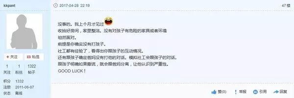 会员@kkpant:没事的。我上个月才见过,收拾好房间,家里整洁。没有对孩子有危险的家具或者环境,坦然面对。前提是你确实没有打孩子。社工都有经验了,看得出你跟孩子的互动情况。还有跟孩子确定爸妈没有打他的对话。模拟社工会跟孩子的对话。跟孩子明确如果撒谎,就会跟爸妈分离,让他认识到严重性。GOOD LUCK!