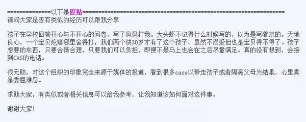 事情是这样的,会员“四月的多伦多”的孩子在学校填写调查问卷时写到妈妈打了自己,于是敏感的学校就把该情况报告给了CAS,随后CAS便打电话来说要进行家访。