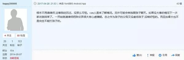 % q% i1 s3 Z' _1 [0 Q. a+ }会员@happy200666:根本不用请律师,这事我经历过。没那么可怕。cas人是来了解情况。另外可能会单独跟孩子聊天。如果没大事的情况下一次家访就结束了。一开始就请律师把阵仗弄很大有心虚嫌疑。总之作为孩子的父母又没虐待孩子,没啥好怕的。而且加拿大也不是完全不能打孩子的。