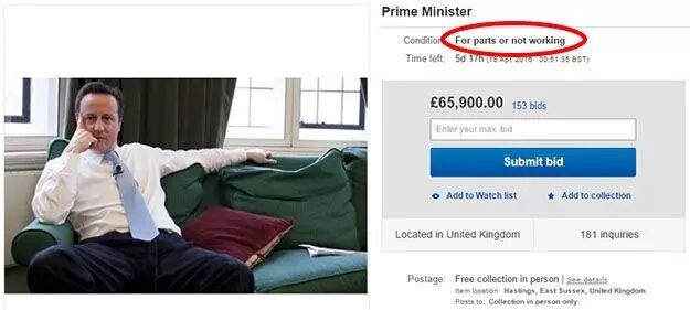 话说,在线购物简直是互联网功能里最伟大的部分之一。。。 尤其因为有了在线拍卖这个东西,你能在网上看到的东西,永远比你剁手的范围还大出好几个银河系。 比如去年腐国前首相卡梅伦被爆出逃税丑闻的时候,一个腐国汉子一气之下就把他丢到ebay拍卖了。。。 宝贝状态:“不是很好用,需要返厂”