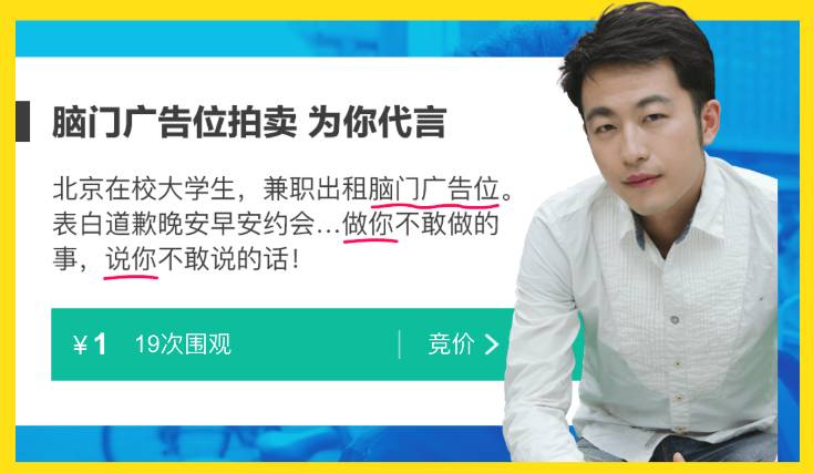 北大西班牙语系校草的夏鼎—拍卖自己的“直男癌挽救术”—-教导部分男生转型。从言谈举止、穿衣打扮,到简单的思想工作….这校草,有点帅有没有~~ 来拍卖自己脑门做广告位~这个技能我给满分……! 除了以上这些外还有会教hip pop,愿意帮你拎包、陪吃饭、陪逛街的阳光小鲜肉;做事极其有规划性,能帮助你时时刻刻掌握进度,专治你拖延症的可爱妹子。 还有摄影师、时尚博主、漫画家、音乐人,统统有一技之长,要么是手把手教你,还有的直接把自己的作品出售,总之,大家都奉献了自己的才华。 (图片来源于闲鱼拍卖平台)