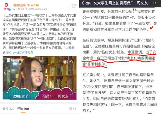不过人家大学生作为成年人,本就具备对自己行为负责的能力,妹子也说了,这种拍卖其实是一个双向选择的过程,和“租女友过年不一样”,危险的规避至少还是可以做到的。 (图片来源:左一微博,右一新民晚报今日头条)