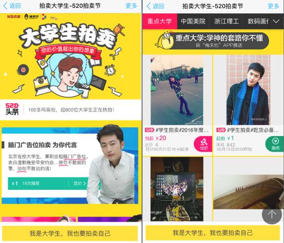 拍卖简直成为了大学生可以更多样多维度展示自己的才华和寻求机会(甚至是就业机会)的平台,至少可以让大学生们验证下自己的能力,到底达到了一个什么级别~ 我觉得吧,中国大学生们,以此作为展示自己能力和才华的方式,也是挺好一个事儿。 怎么样?好奇大学生们的脑洞到底有多大不?想看看现在的大学生们都是多有才不?快一起来围观这次的“520拍卖节”,给你100种不可思议的新想法,还能交个朋友,何乐而不为!