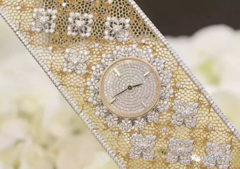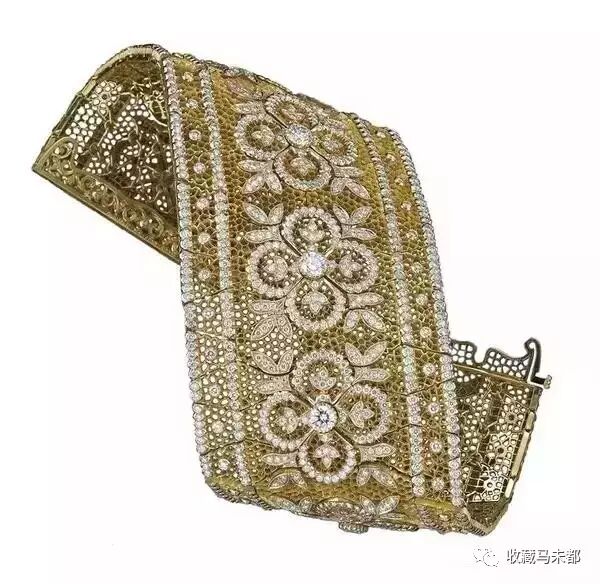 # Z; H' {3 d6 m这件炫目的手镯,黄金为底,钻石镶嵌其上,还隐含了一种传统的珠宝手工艺——雕金工艺。雕金,顾名思义,金属上的雕刻。刻刀在金属上一刀一划的雕刻出美丽的花纹。这是文艺复兴时期金匠们广为使用的一种雕金技法,后来几近失传。 雕金