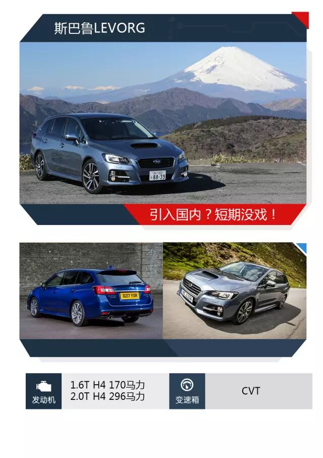 作为目前斯巴鲁旗下主推的一款中型车,斯巴鲁LEVORG在日本本土、欧洲、乃至我国香港、台湾等地都有着极高的人气。新车除了秉承日系车一贯的精致内饰与不错的燃油经济性之外,LEVORG搭载的1.6T和2.0T两款涡轮增压发动机也使得这台日本小车在与欧美众强手的动力比拼中也丝毫不落下风(1.6T与2.0T最大功率分别为168马力和296马力)。 ( n8 Z4 D0 l b3 h; H
