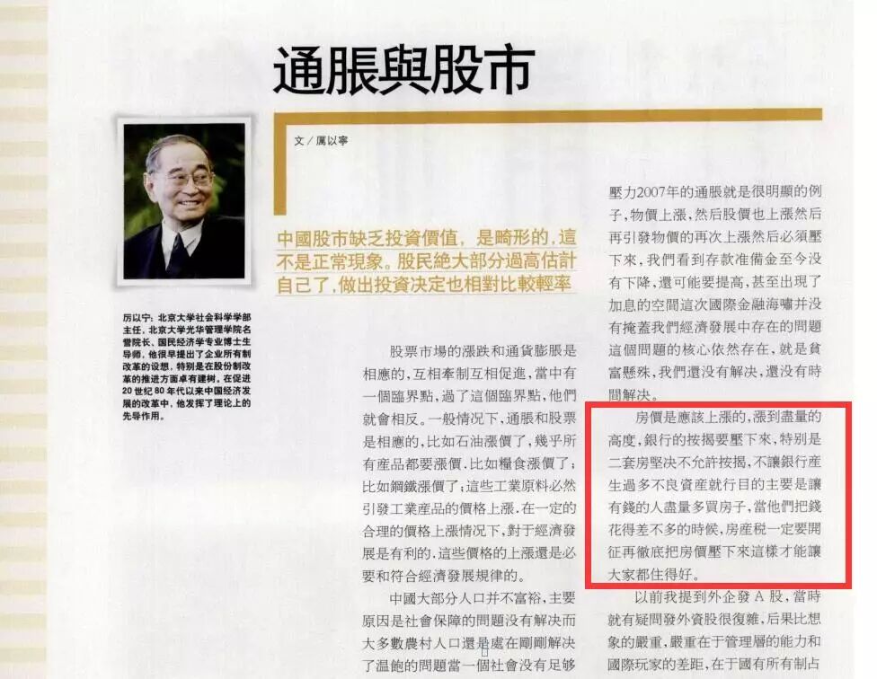 通读全文,现在已经无从知晓,在一篇谈股市的文章中间很突兀地有了这么一段话,谈到了房价,而且后面内容再也没说到楼市。极有可能这是篇采访稿,或者演讲稿节选。