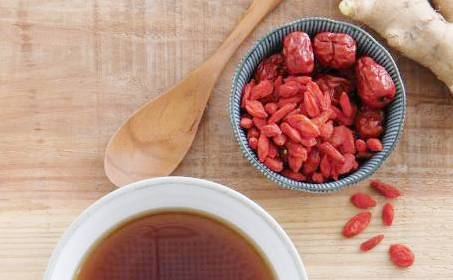 3 f/ t! K7 ?3 N做法:只需将2、3片生姜放入锅中煮沸,3、5分钟后再加入10~15颗枸杞继续煮,2、3分钟后即可饮用。