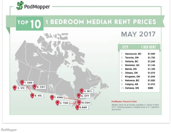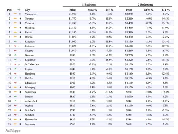 另外,预料之内,一年内租金增长了15%的多伦多排在第二位。即使多伦多房价下跌了,一室租金降低了1.7%,均价达到$1,750,二室房屋租金下降0.9%至$2,250,排名仍是很靠前啊。