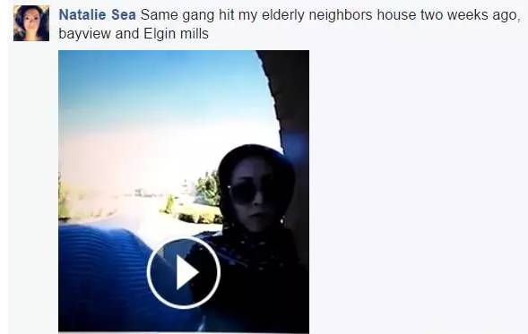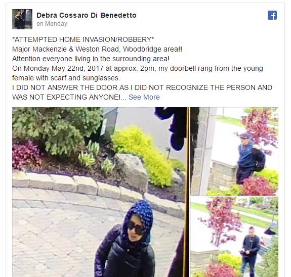 大多伦多Woodbridge地区一位居民险些遭遇了一个团伙的入室抢劫。事后她在facebook讲述了事情经过: