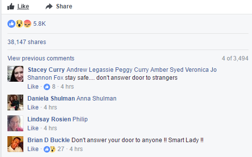 本周一下午2点,居民Debra Di Benedetto听到门铃响,她过去一看是一位头系围巾、带着墨镜的女子站在门前。 “My daughter and I were home alone at the time and I was just doing some things around the house – some laundry – the doorbell rang, I wasn’t expecting anyone and neither was she” "当时只有我和我的小女儿在家。我正在做些家务(洗衣服),忽然听到门铃在响。根本想不到是谁会来突然拜访。"