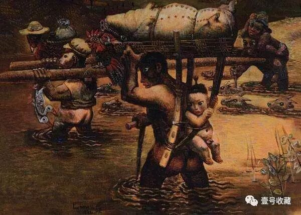 . f& J4 D2 O4 r d$ W罗中立《渡河赶场》创作于1991年,是罗中立风格转型阶段的重要作品。他用梦幻般的场景表现出了一种中国乡村生活的特有诗意。在作品中,罗中立将农民与其赖以为生的大地紧密联系在了一起,通过对具体物件的夸张性描绘,展现了他们朴拙而又充满情趣的生活世界。画面中那种跳动的笔触使作品充满民间文化特有的泥土气息和真实的厚重感。