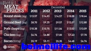 : U2 F6 Z$ o' q% R8 L/ O近年来加拿大肉食品价格走势 © Statitics Canada/CBC