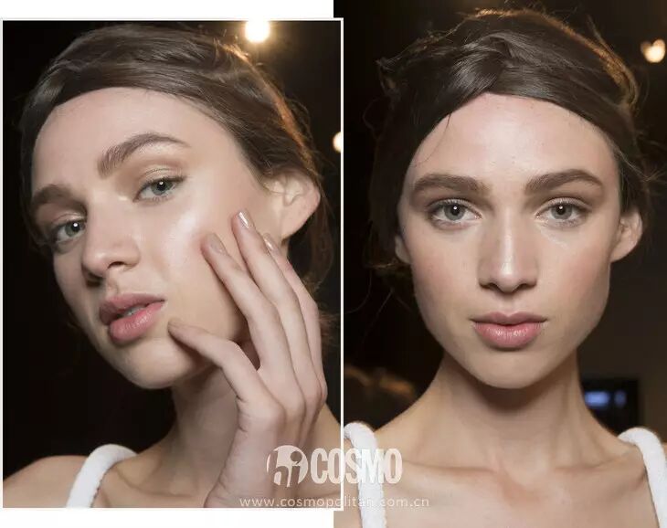 一般秋冬妆容我们会立刻想到哑光和雾面这两种质感,但其实纯雾面的妆容已经不再流行,并且会令面孔死气沉沉。在局部适当加入高光色,让妆容更加鲜活,但一定不能大面积运用,比如下面这几款,在眼头、颧骨处和唇中,妆感立刻精致和高级。