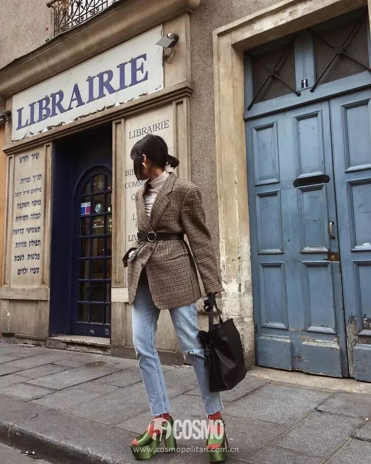! H- F. k; b# m& Z l钟爱格纹的复古又担心老气,可以学学与牛仔裤的搭配组合。两个经典单品混搭在一起不会太过跳跃,再给外套上系上一条腰带更加有范儿。