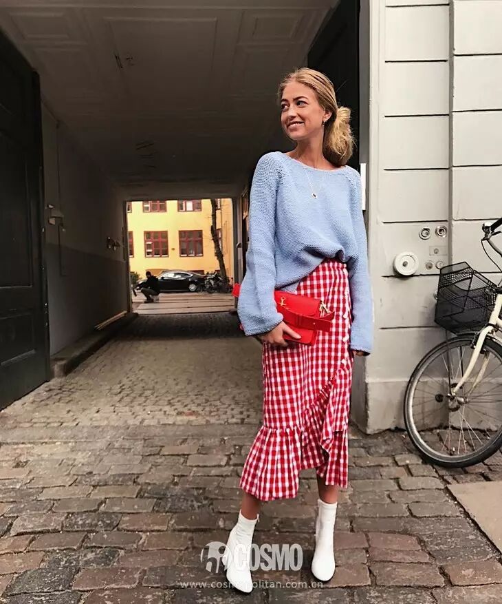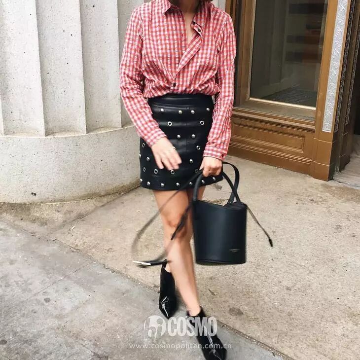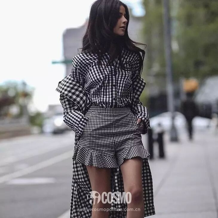 格纹半身裙选择更多,荷叶边、不对称、开衩裙都是今年流行款式。搭配起来也不费事,一件简约衬衫或针织衫就足够时髦。 8 q; K% [" a8 R