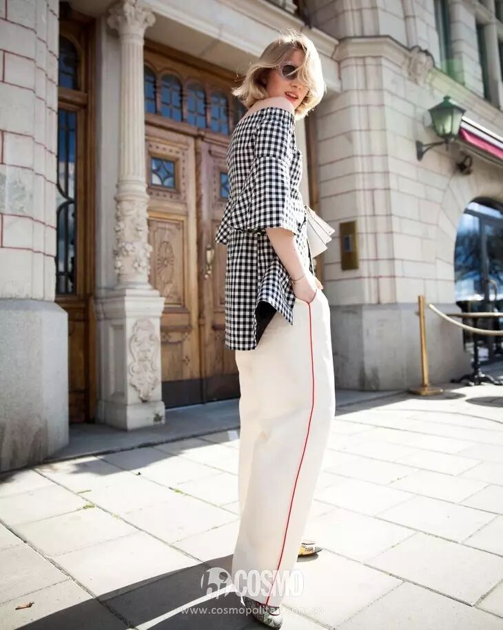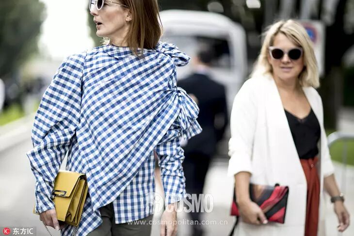 这两季的格纹衫可是变尽花样夺人眼球,腔调十足。今年流行的绑带、荷叶边、不对称、泡泡袖元素与格纹简直就是天生一对。 " p7 o, {! r3 e) u; ?! @: c