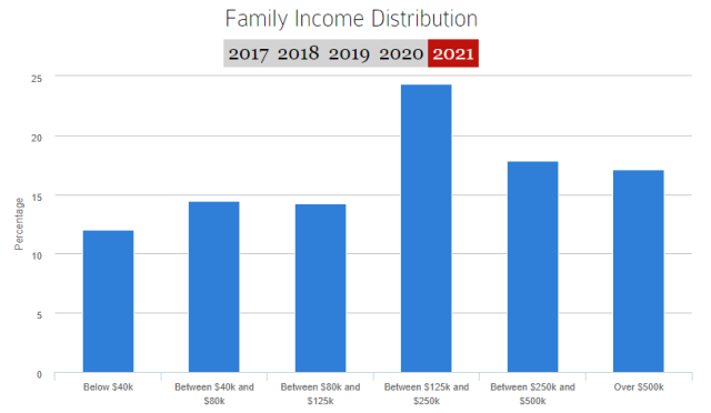 " W. r9 I7 r& m. k/ b! p大多数就读哈佛的学生都来自于中产以上的富裕家庭。从调查的数据来看,超过40%的新生家庭年收入在12.5-50万美元之间,17.1%的新生家庭年收入超过了50万美元,仅有12%家庭年收入在4万美元以下。