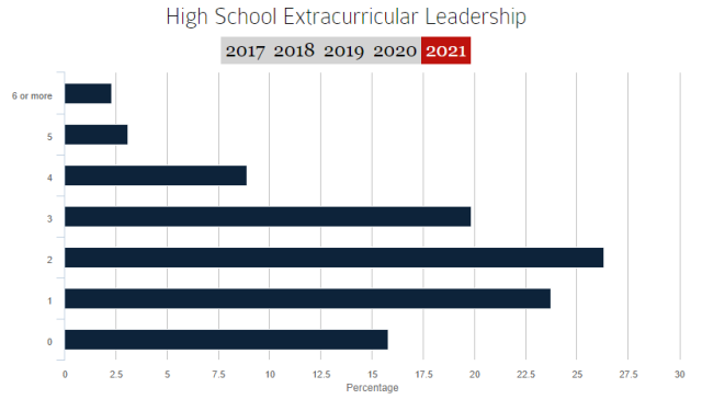 一点也不意外的是,84.2%的新生都在课外活动组织中担任过领导者的角色,其中三分之一担任过3个及以上领导职务。