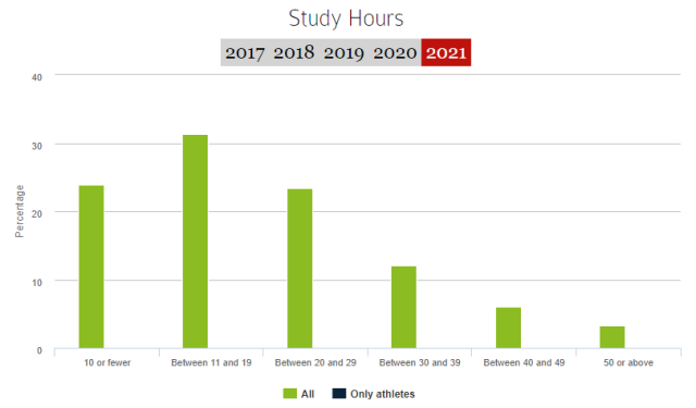 美国学生的学习时间不如中国学生多,这在哈佛的这项调查中也得到了佐证。55.2%的新生高中时期每周学习时间在20个小时以下,平均每天不到3小时。 : f: B* z5 l$ G: ^" C3 R& m
