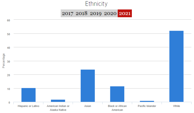 参与调查的2021届新生中,52.1%为白人,23.8%为亚裔,11.4%为非裔,10.2%为拉丁裔。 0 R- S9 H7 ^( ^