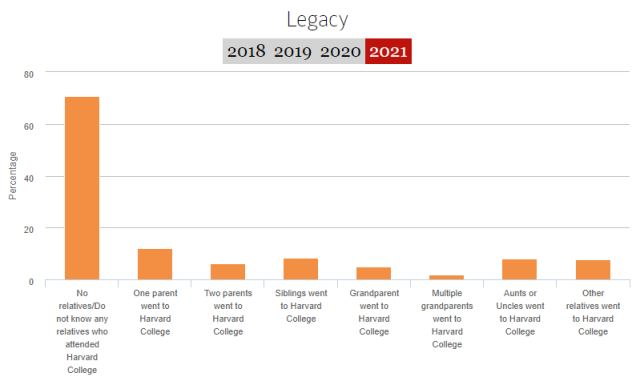 2021届哈佛新生中,29.3%的人来自于校友家庭,这意味着每3个人中就有约一人来自校友家庭。其中,12.1%的新生父母有一方曾就读于哈佛,6.2%的新生父母双方都毕业于哈佛。 - ?+ W- V) g) _! \