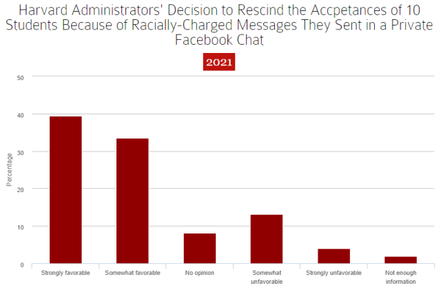 今年5月,哈佛大学招生办取消了至少10名新生的入学资格,原因是这些新生在Facebook的小组上发布了带有侮辱和歧视性的表情包和信息,例如嘲讽性骚扰受害者、犹太人大屠杀以及遇难儿童的表情包。哈佛的铁腕在社会上引发了关于“是否侵犯学生言论自由权”的热议。 6 q4 J3 y. f& e$ O