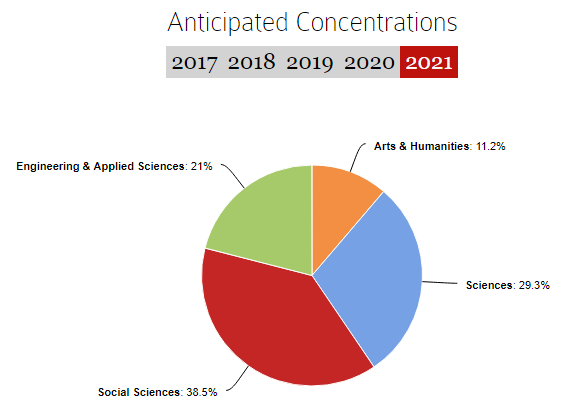 38%的哈佛新生希望在大学中选择社会科学类专业,29.3%的学生希望选择科学类专业,21%的学生期望选择工程和应用科学类专业。与此相反的是,只有11%的学生表现出对艺术和人文领域的兴趣,人文学科依旧难挽颓势。 1 Y3 v4 q8 J( M# }" D