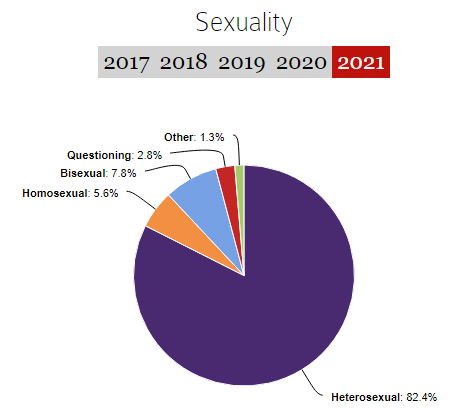 美国大学以自由、包容著称,这也表现在了学生的性取向方面。哈佛学生们在调查中勇敢地表达出了不同的性取向。82.5%的受访者表示自己是异性恋,5.6%的人坦诚自己是同性恋,7.9%的人是双性恋,还有3%的人质疑自己的性取向。